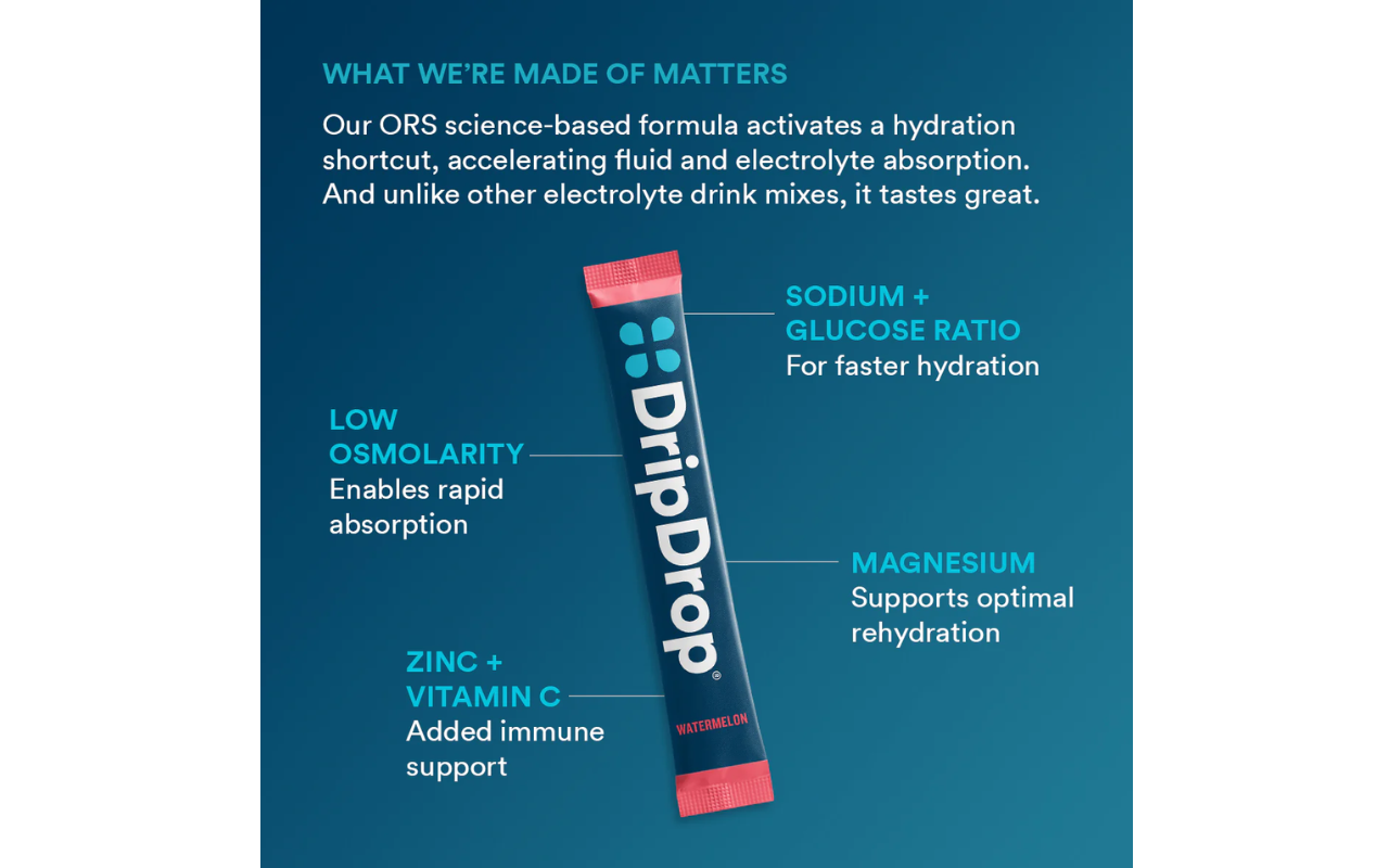DripDrop contains the sodium electrolyte levels and lower glucose content required to facilitate fast fluid absorption, AND it tastes great. Packed with essential electrolytes like sodium, potassium, and magnesium, plus zinc and vitamin C for immune support, it's an effective rehydration solution.
