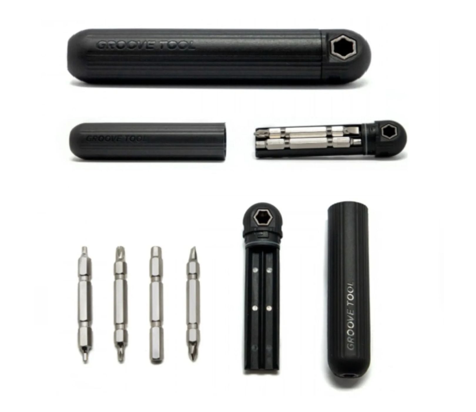 The Ryder Groove Tool Pro is a compact, robust multi-tool designed for cyclists who value efficiency and reliability. Weighing just 100 grams, its CNC machined alloy body features a minimalist, water-resistant design with internal bit storage for convenience. The tool's versatile ‘T’ and ‘I’ configurations make it perfect for hard-to-reach adjustments, while the nickel-plated bits and vanadium insert provide durability. Machined ridges ensure a secure grip, and the rubber o-ring protects against moisture. The custom Slyder Sleeve mount allows you to attach it nearly anywhere on your bike, keeping it accessible and ready for any repair. Features: - Minimalist design (100g with 5 bits) - CNC machined alloy construction - Ideal for hard-to-reach places: can be used in a ‘T’ or ‘I’ position - 5 Nickel-plated bits: - 6 Hex (allen) keys: 2-6 - 2 Screwdrivers: Star & flat - 2 Torx screwdrivers: T10 & T25 - Magnets to secure tool bits when in use or being stored - Vanadium insert for strength in T position - Machined ridges to ensure firm grip - Rubber o-ring provides a tight seal and protects nickel-plated bits from moisture - Customized Slyder Sleeve mounts almost anywhere on the seatpost/frame with anti-slip velcro