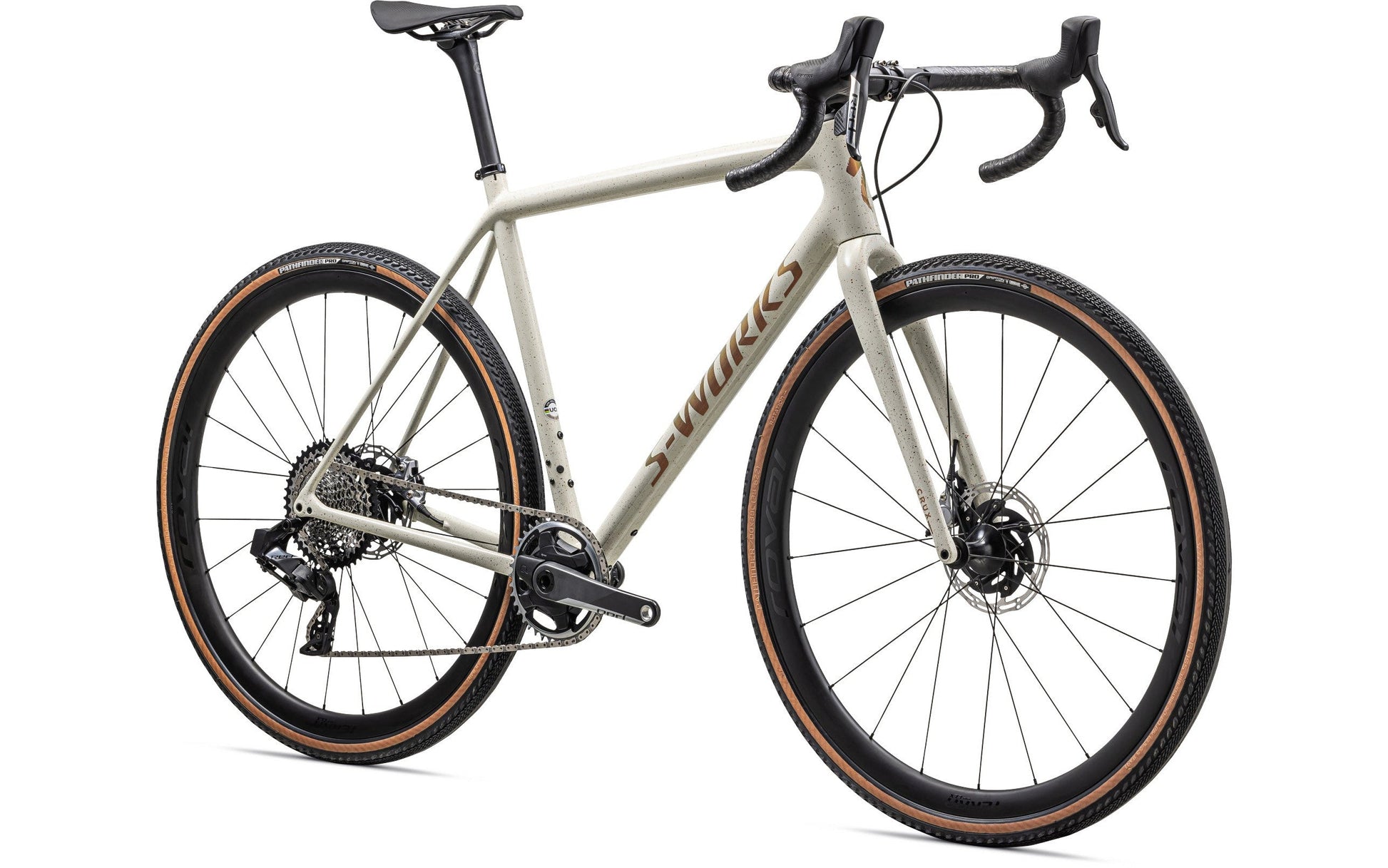 This S-Works Crux comes spec'd with SRAM's pinnacle RED eTap AXS hydraulic disc groupset, lightweight and durable Roval Terra CLX Disc wheels, and 2Bliss Ready, 700x38mm Pathfinder Pro tires that hookup over nasty terrain.