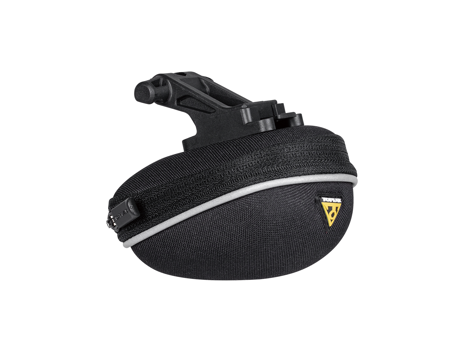 A weather resistant mountain bike saddle bag to carry the essentials. Constructed from 600 denier polyester and EVA foam the bag has one main compartment that has enough room for a spare tube, multi tool and levers (small). Mounting is easy thanks to the QuickClick technology which means a simple slide and click, and the bag is secure. To remove, a simple push of a button unlocks the system for easy removal. Finished with 3M reflective piping to help keep you visible in low light conditions.